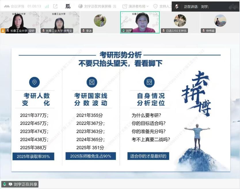 刘宇重点介绍了英语语言文学和外国语言学及应用语言学两个方向的导师团队,并结合数据分析了近五年全国考研的整体形势,帮助考生理性评估备考难度。还列举了多名优秀毕业生的就业去向,并提醒考生关注本年度两个英语专业方向在初试命题形式上的最新调整,为复习提供精准指引。